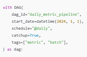 - run_daily_metric에서 context["ds"]를 꺼내서 save_daily_metric(ds) 수행