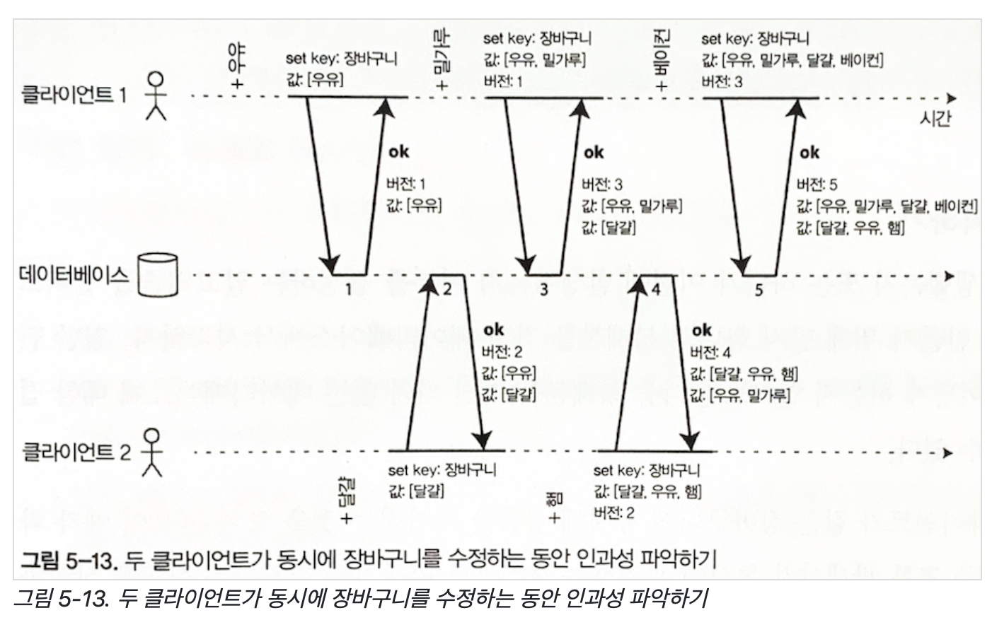 - w + r > n 으로 설정하면 읽은 노드 중 최신 값을 가진 노드가 하나 이상이어야 함. (그림 5-11)