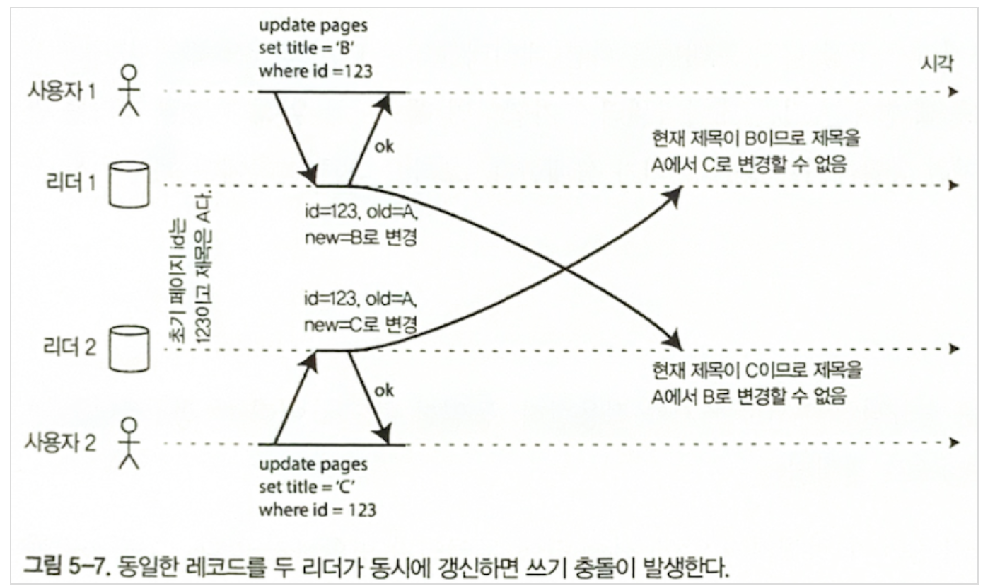 - 따라서 다중 리더 복제 시스템을 사용하려면 이런 문제를 인지하고 문서를 주의깊게 읽은 다음 데이터 베이스를 철저하게 테스트해봐야 함