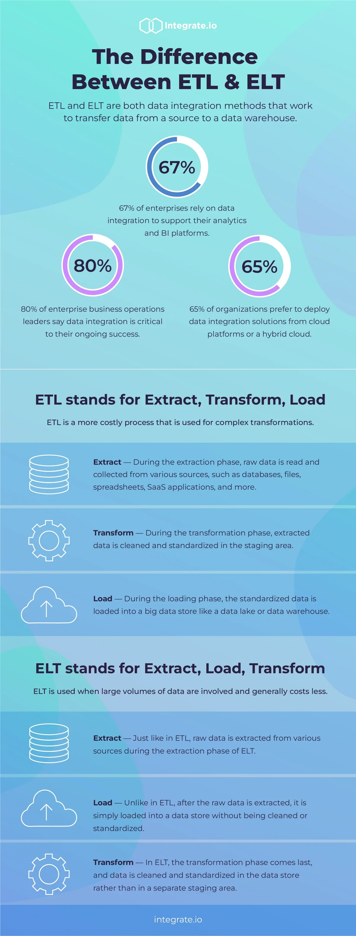 정보 소스는 구조화된 SQL 데이터베이스를 사용하든 구조화되지 않은 NoSQL 데이터베이스를 사용하든 상관없이 동일하거나 호환 가능한 형식을 거의 사용하지 않으므로, ETL과 ELT는 데이터 과학 분야에서 필수적이다. 따라서 데이터 소스를 먼저 정리, 보강, 변환한 후에 하나의 분석 가능한 전체로 통합해야 한다. 이러한 방식으로 비즈니스 인텔리전스 플랫폼(Ex: Looker, Chartio, Tableau, QuickSight)이 데이터를 이해하여 인사이트를 확보할수 있다.