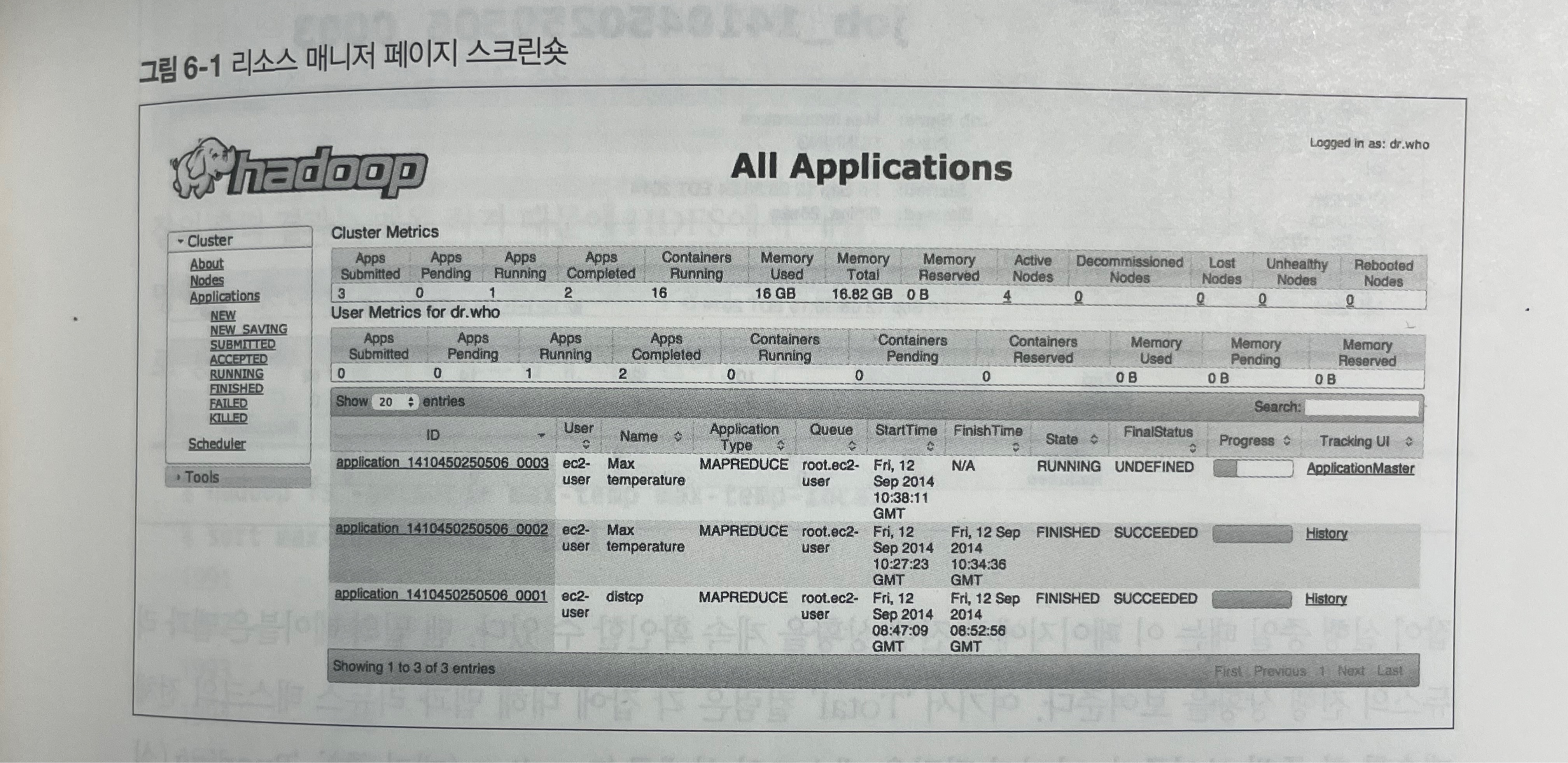 출력 결과를 보면 RUNNING, KILLED, SUCCEEDED와 같은 잡의 상태를 알수 있다 오지 웹 UI 에서 이러한 정보를 확인할 수 있다.