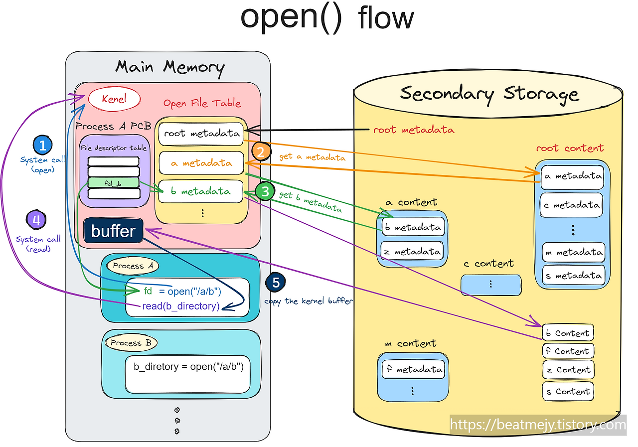 - Process A의 코드에서 d_directory = open("a/b") 시스템 콜을 전달하여 b파일의 메모리주소를 요청합니다.