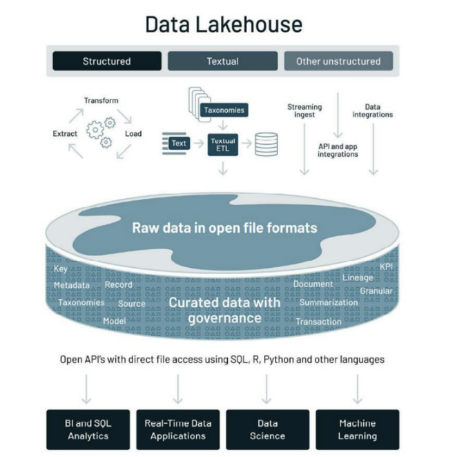 심지어 정형 데이터에만 적용되던 ACID 트랜잭션이나 별도의 제품으로 구현되던 데이터 계보관리 기능을 비정형 데이터에도 모두 적용할 수 있게 됩니다. 데이터 레이크에 파일 수준으로 저장되던 비정형 데이터들을 아파치 아이스버그(Apache Iceberg)나 델타레이크(Delta lake)등을 이용해 논리적 테이블 수준으로 변환해 관리할 수 있으므로, 비정형 데이터를 활용하는 머신러닝 프로젝트도 손쉽게 진행할수 있습니다.