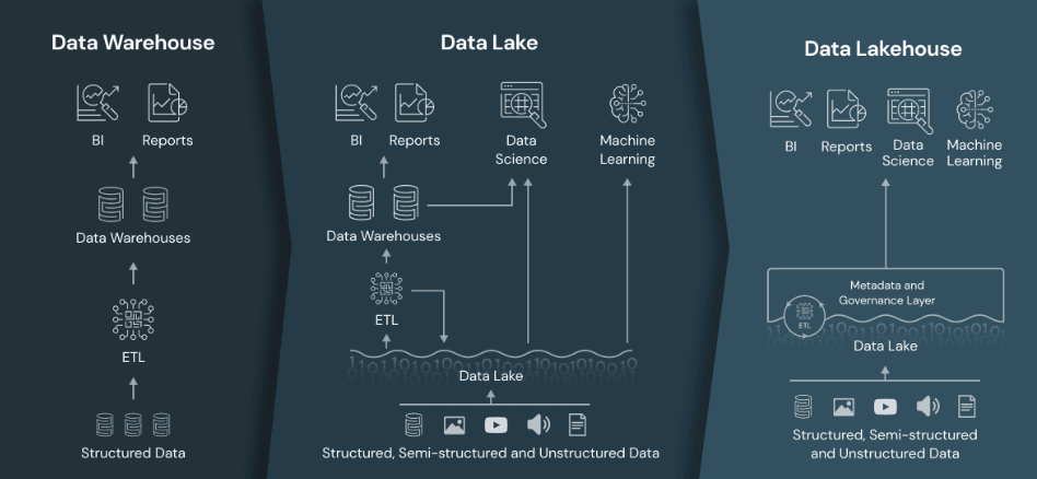 또 다른곳에 데이터를 복제하지 않고도 원천 데이터를 BI 도구와 연결하거나 활용할 수 있기에, 데이터 웨어하우스의 단점이었던 데이터 중복 저장이나 최신화가 어렵다는 문제를 해결할 수 있습니다. 데이터의 정합성과 일관성이 유지되는 데이터 웨어하우스의 장점과 관련된 ACID트랜잭션 지원 및 주요 스키마의 지원도 가능하게 됩니다.