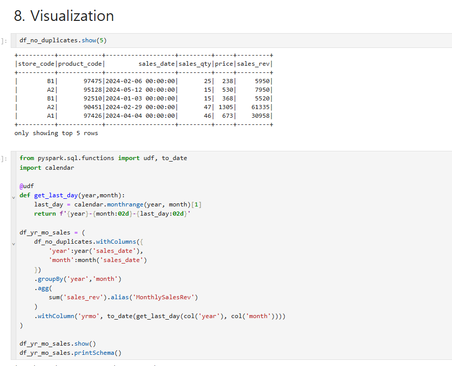 두번째는 데이터프레임의 이름을 정해주고, 전체 회사차원에서 "지점별 모든 매출을 합산해서 월별 매출을 보고싶다" 라고 가정하에 year(년 결과) month(월 결과)를 활용했고,년월 단위로 그룹핑을 하고 aggrigation을 활용해서 sum을 해주었고,