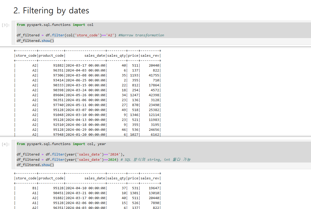 Spark에서 필터링은 명령이 매우 간단합니다. 첫번째는 스토어코드 점포명이 A2로 되어있는 점포만 추출한 결과입니다.
