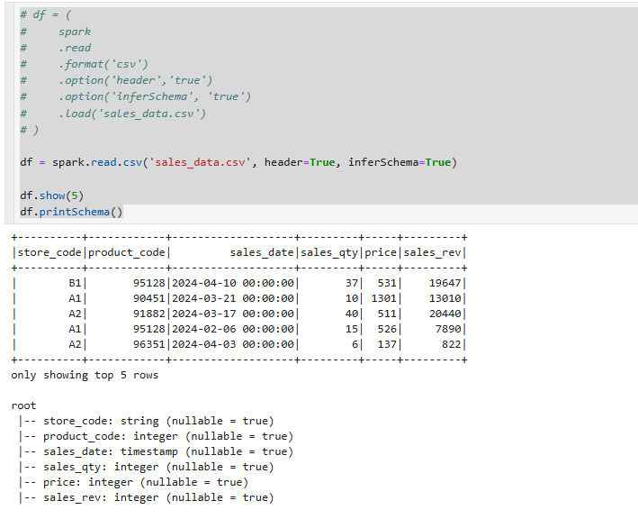 주석처리한 방식으로 불러올수도 있으나,spark.read.csv로 path를 걸고 header값을 넣고, inferSchema를 True로 넣습니다.