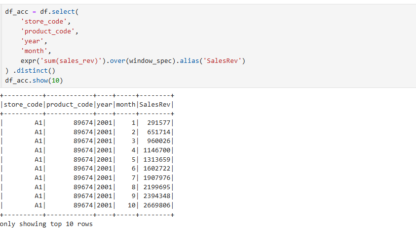 df_rev_acc로 sales_date 날짜별로 취합한데이터를 expr를 활용해서 sum을 한 상황입니다.