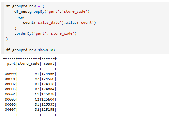 df.group을 불러오고 partition단위로 보고싶어서 part와 store_code를 가져오고, orderBy를 통해서 정렬해주는 모습입니다.