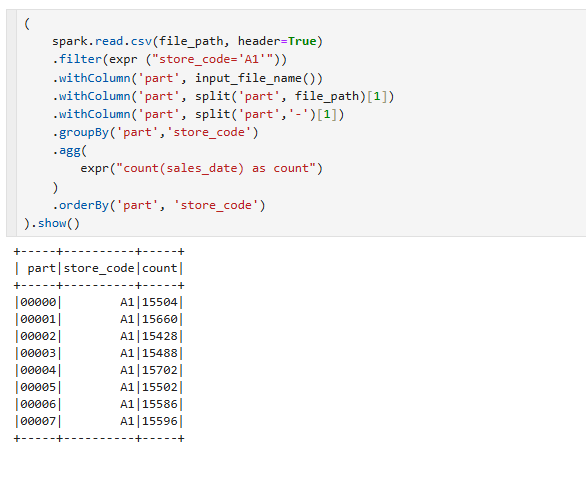 groupby를 해주고 agg에 expr을 해서 count해준 결과입니다. 실제로 partition 0에 대해서만 A1으로 해서 Count가 집계가 된걸 알수가 있습니다. 그러면 똑같이 명령을 복사해서 이번에는 원래의 file_path와 비교해보도록 하겠습니다.