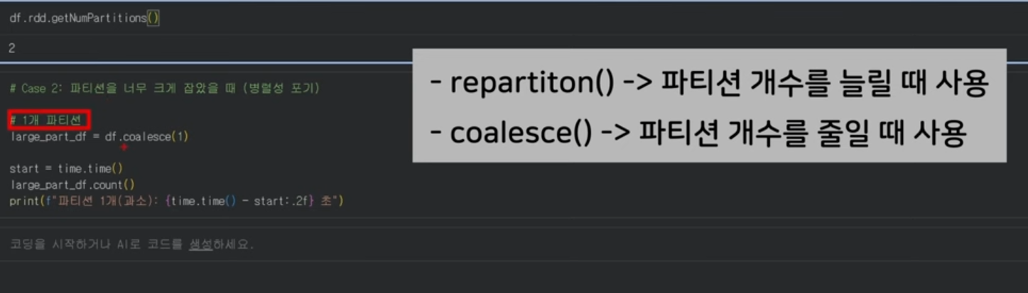 - coalesce(n): 셔플을 최소화하며 파티션 수를 줄입니다. 주로 필터링 후 데이터가 작아졌을 때 파일을 저장하기 직전 사용합니다.