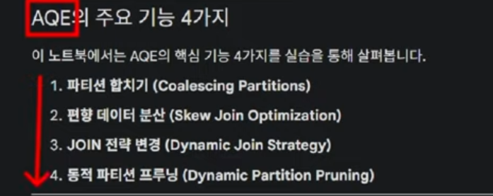 - 동적 병합: 셔플 후 작아진 파티션들을 자동으로 합쳐(Coalescing) 태스크 낭비를 막습니다.