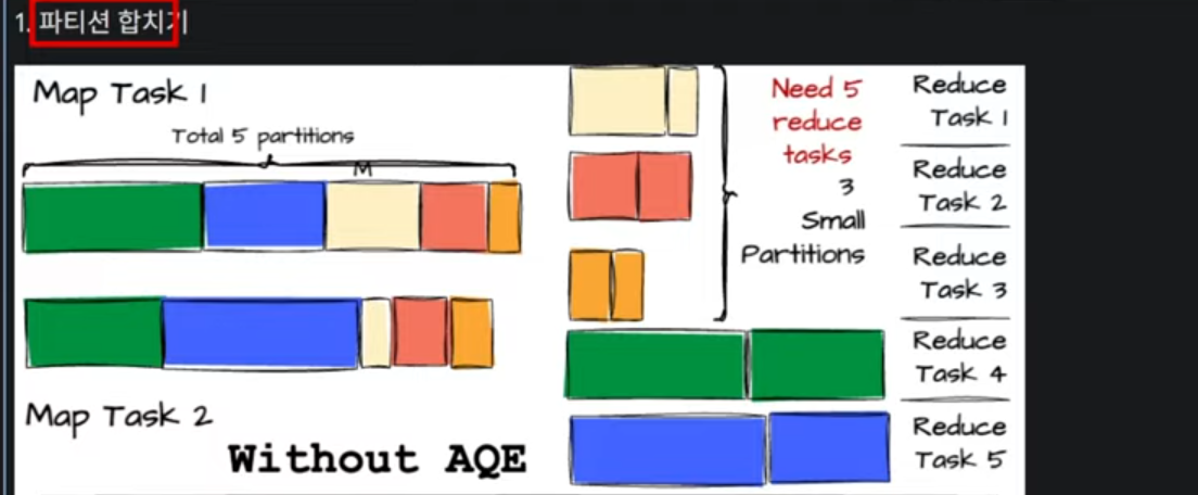 왜냐면 파티션 하나당 Task가 하나씩 할당이 되게 되는데, 자잘한 파티션들이 많아지면 Task가 많아져서 Spark작업에 부하가 걸릴수도 있기 때문입니다. 그래서 AQE는 자잘하게 나눠진 파티션들을 하나의 파티션으로 합쳐주는것입니다.