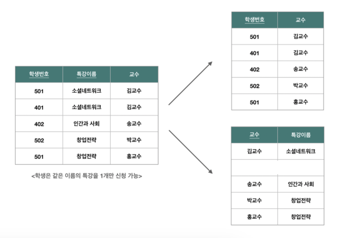 - 교수 - 특강 릴레이션은 교수와 특강이 함수 종속 관계를 띄우며, 교수가 유일한 후보키이자 기본키이다. 즉, 후보키가 아닌 결정자가 존재하지 않기 때문에 BCNF에 속한다
