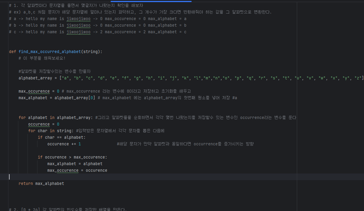 두번째는 0 * 26 각 알파벳의 빈도수를 저장한 배열을 만들고 문자열을 돌면서 해당 문자의 알파벳이면