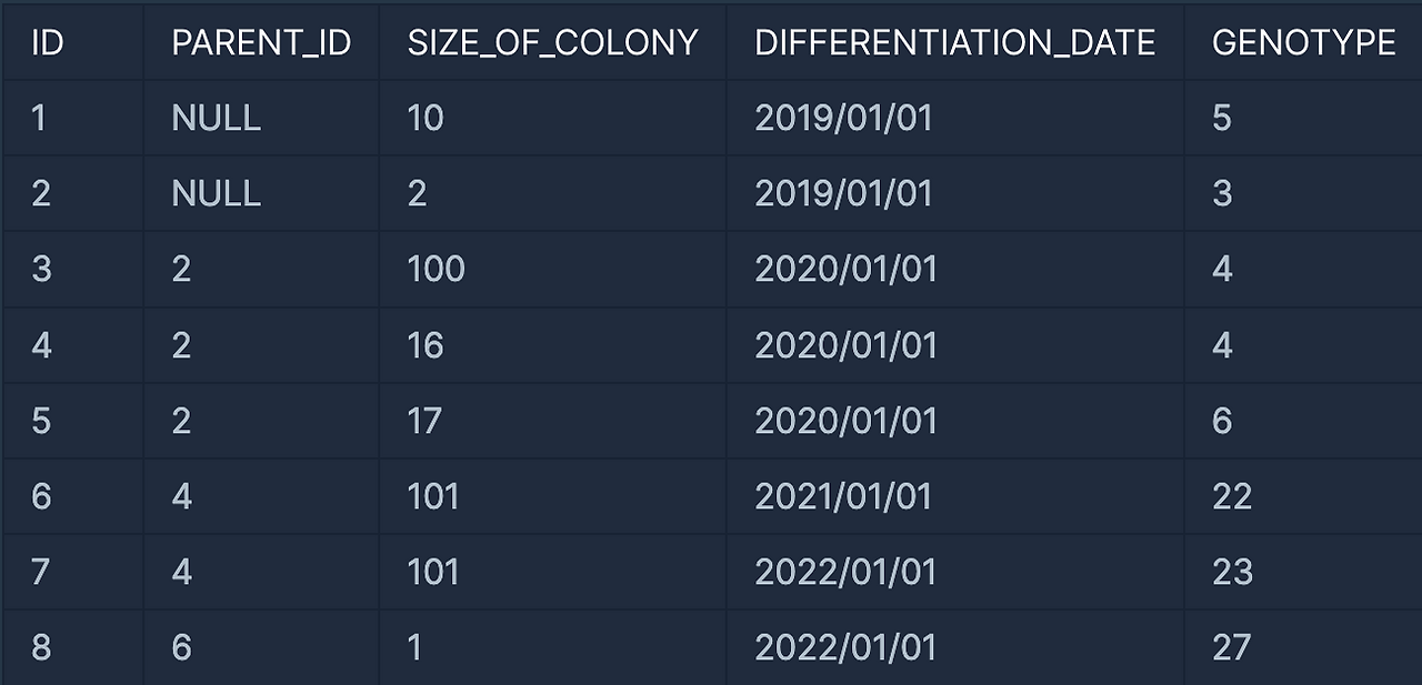 | ID | PARENT_ID | SIZE_OF_COLONY | DIFFERENTIATION_DATE | GENOTYPE |
