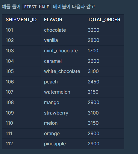 2. 아이스크림 맛을 조회하는 SELECT 문을 작성해준다.