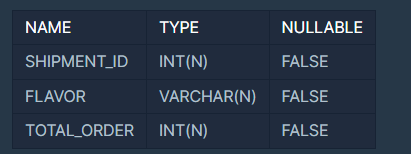 LY 테이블 구조는 다음과 같으며, SHIPMENT_ID, FLAVOR, TOTAL_ORDER 은 각각 아이스크림 공장에서 아이스크림 가게까지의 출하 번호, 아이스크림 맛, 7월 아이스크림 총주문량을 나타냅니다. JULY 테이블의 기본 키는 SHIPMENT_ID입니다. JULY테이블의 FLAVOR는 FIRST_HALF 테이블의 FLAVOR의 외래 키입니다. 7월에는 아이스크림 주문량이 많아 같은 아이스크림에 대하여 서로 다른 두 공장에서 아이스크림 가게로 출하를 진행하는 경우가 있습니다. 이 경우 같은 맛의 아이스크림이라도 다른 출하 번호를 갖게 됩니다.