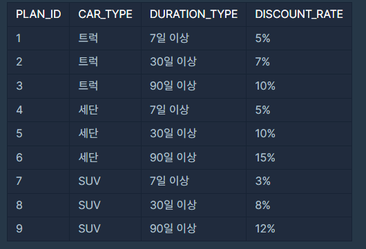 CAR_RENTAL_COMPANY_DISCOUNT_PLAN 테이블은 아래와 같은 구조로 되어있으며, PLAN_ID, CAR_TYPE, DURATION_TYPE, DISCOUNT_RATE 는 각각 요금 할인 정책 ID, 자동차 종류, 대여 기간 종류, 할인율(%)을 나타냅니다.