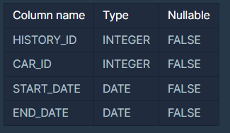 CAR_RENTAL_COMPANY_RENTAL_HISTORY 테이블은 아래와 같은 구조로 되어있으며, HISTORY_ID, CAR_ID, START_DATE, END_DATE 는 각각 자동차 대여 기록 ID, 자동차 ID, 대여 시작일, 대여 종료일을 나타냅니다.