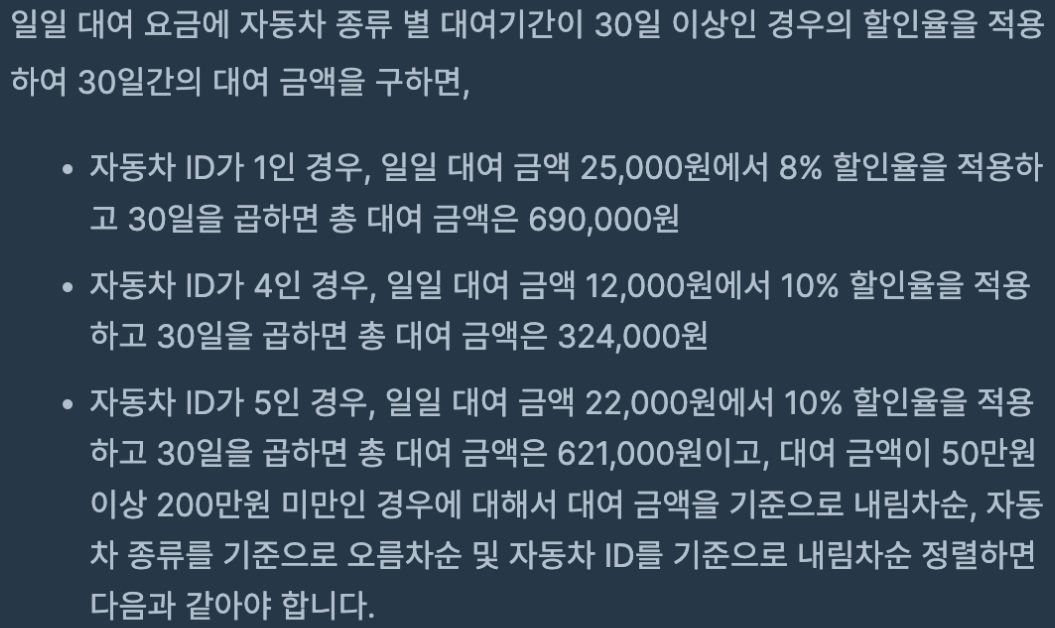 자동차 ID가 5인 경우, 일일 대여 금액 22,000원에서 10% 할인율을 적용하고 30일을 곱하면 총 대여 금액은 621,000원이고, 대여 금액이 50만원 이상 200만원 미만인 경우에 대해서 대여 금액을 기준으로 내림차순, 자동차 종류를 기준으로 오름차순 및 자동차 ID를 기준으로 내림차순 정렬하면 다음과 같아야 합니다.