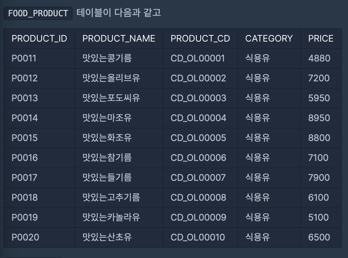 다음은 식품의 정보를 담은 FOOD_PRODUCT 테이블과 식품의 주문 정보를 담은 FOOD_ORDER 테이블입니다. FOOD_PRODUCT 테이블은 다음과 같으며 PRODUCT_ID, PRODUCT_NAME, PRODUCT_CD, CATEGORY, PRICE는 식품 ID, 식품 이름, 식품코드, 식품분류, 식품 가격을 의미합니다.