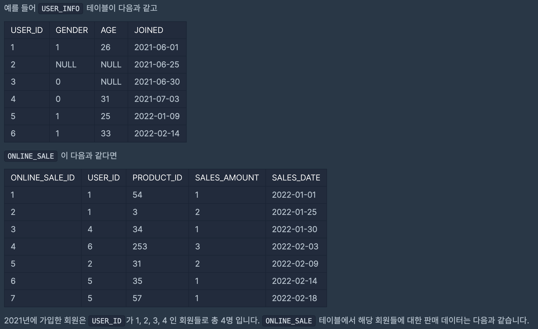다음은 어느 의류 쇼핑몰에 가입한 회원 정보를 담은 USER_INFO 테이블과 온라인 상품 판매 정보를 담은 ONLINE_SALE 테이블 입니다. USER_INFO 테이블은 아래와 같은 구조로 되어있으며 USER_ID, GENDER, AGE, JOINED는 각각 회원 ID, 성별, 나이, 가입일을 나타냅니다.