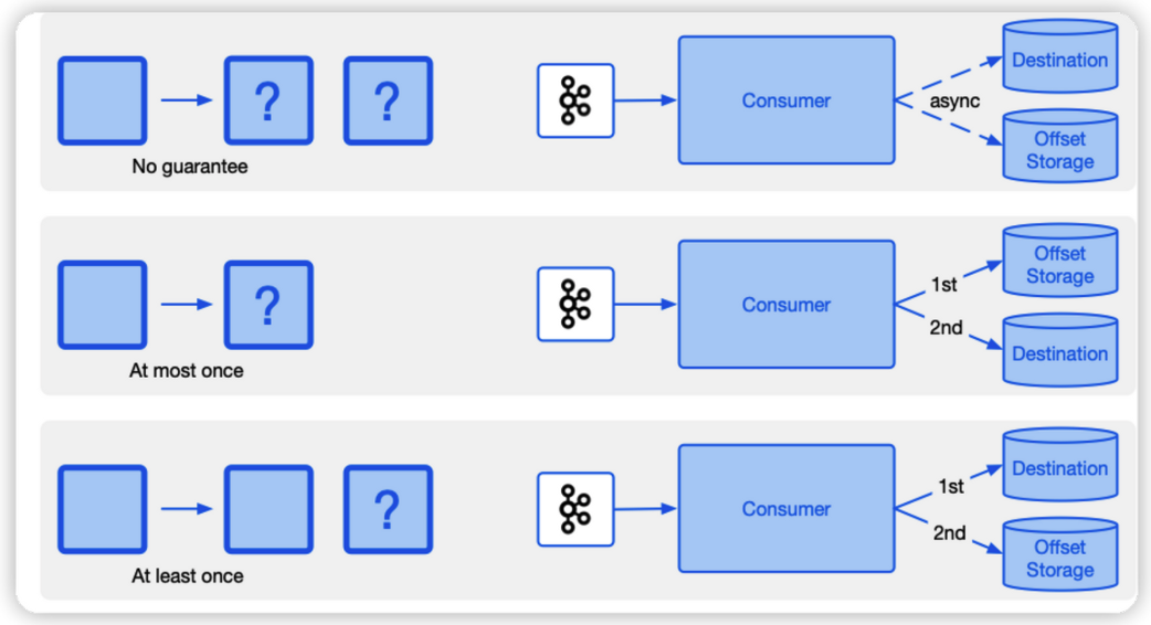- At most once: consumer에서 offset을 먼저 지정하고 Kafka Broker에 메세지를 전달