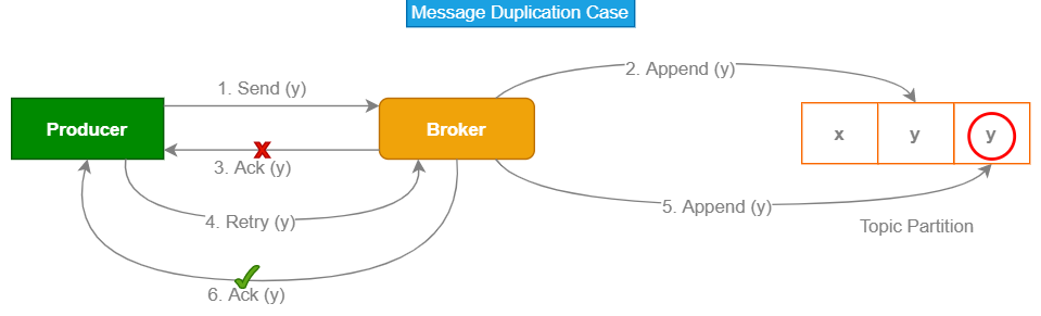 여기서 Producer와 Consumer에서 메세지 유실 또는 메세지 중복 처리가 발생할 수 있고, 이는 멱등성을 보장하지 못한다.