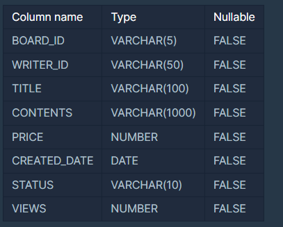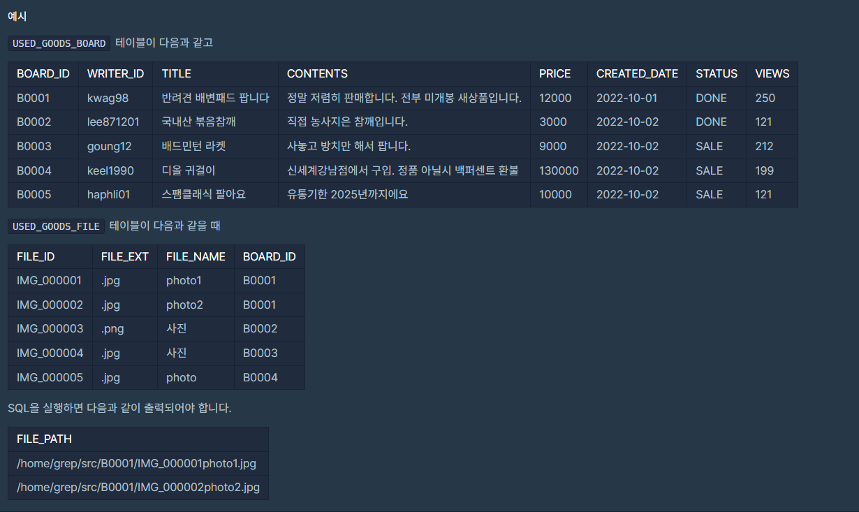 다음은 중고거래 게시판 정보를 담은 USED_GOODS_BOARD 테이블과 중고거래 게시판 첨부파일 정보를 담은 USED_GOODS_FILE 테이블입니다. USED_GOODS_BOARD 테이블은 다음과 같으며 BOARD_ID, WRITER_ID, TITLE, CONTENTS, PRICE, CREATED_DATE, STATUS, VIEWS은 게시글 ID, 작성자 ID, 게시글 제목, 게시글 내용, 가격, 작성일, 거래상태, 조회수를 의미합니다.