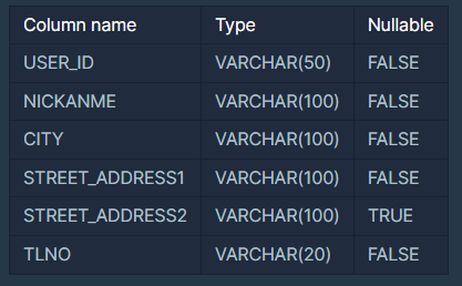 USED_GOODS_USER 테이블은 다음과 같으며 USER_ID, NICKNAME, CITY, STREET_ADDRESS1, STREET_ADDRESS2, TLNO는 각각 회원 ID, 닉네임, 시, 도로명 주소, 상세 주소, 전화번호를 의미합니다.