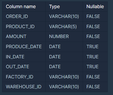 다음은 식품공장의 주문정보를 담은 FOOD_ORDER 테이블입니다. FOOD_ORDER 테이블은 다음과 같으며 ORDER_ID, PRODUCT_ID, AMOUNT, PRODUCE_DATE, IN_DATE,OUT_DATE,FACTORY_ID, WAREHOUSE_ID는 각각 주문 ID, 제품 ID, 주문양, 생산일자, 입고일자, 출고일자, 공장 ID, 창고 ID를 의미합니다.