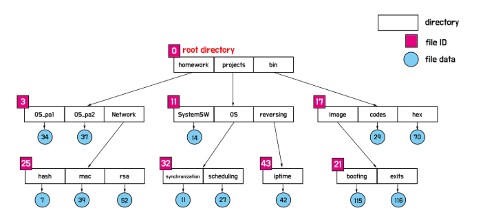하지만 디렉토리는 단순히 파일과 디렉토리를 nesting 하는데 그치지 않고, 자신이 가진 파일과 디렉토리의 metadata 또한 가지고 있다. metadata란, 특정 데이터를 설명해주는 데이터이다. 예를 들면 특정 파일의 생성시간, 파일이름 등을 담은 정보가 그 파일의 metadata 이다. 위의 그림에서 디렉토리들은 file ID를 가지고 있는데, file ID 또한 metadata의 일종이다.