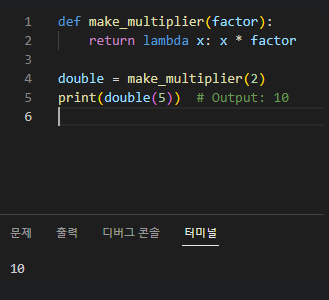 4. 함수 또는 람다 함수 반환: 함수는 변수에 할당하고 나중에 호출할 수 있는 다른 함수 또는 람다 함수를 반환할 수 있다.