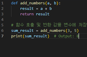 이 예에서 add_numbers 함수는 두 개의 매개변수 a 및 b를 사용하여 합계를 계산하고 return 문을 사용하여 결과를 반환한다.