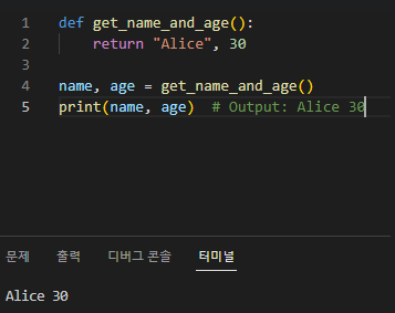 함수가 호출되면 리턴 값이 sum_result 변수에 저장되어 출력된다. 함수는 여러 값을 튜플로 반환할 수도 있다. 예를들면 다음과 같다.